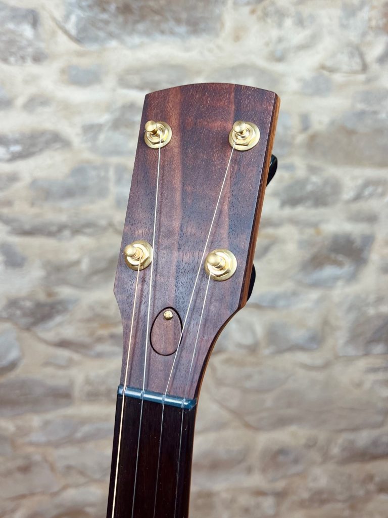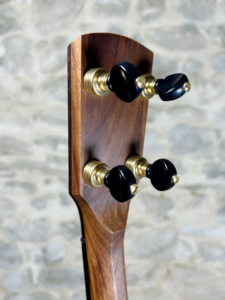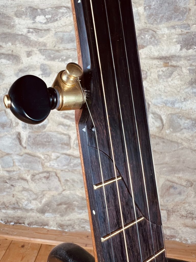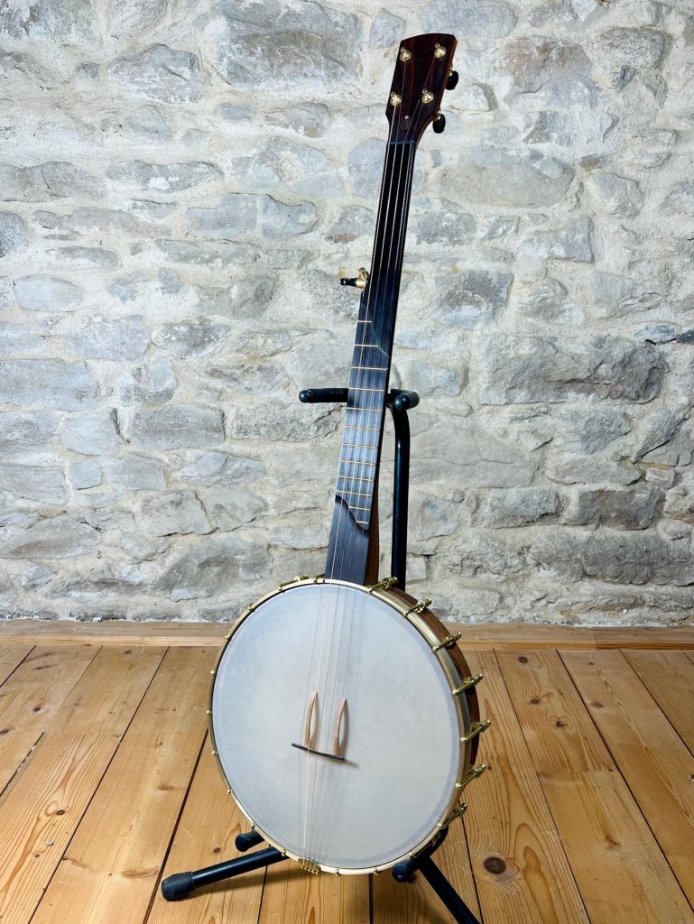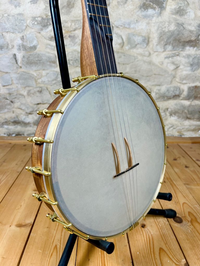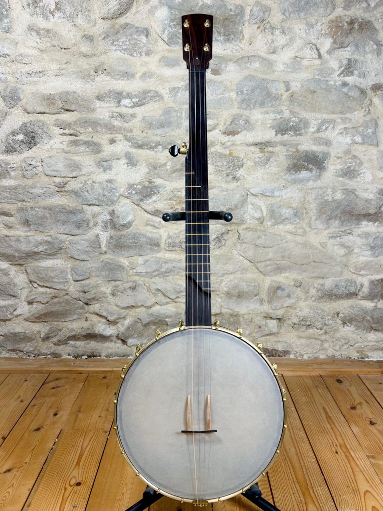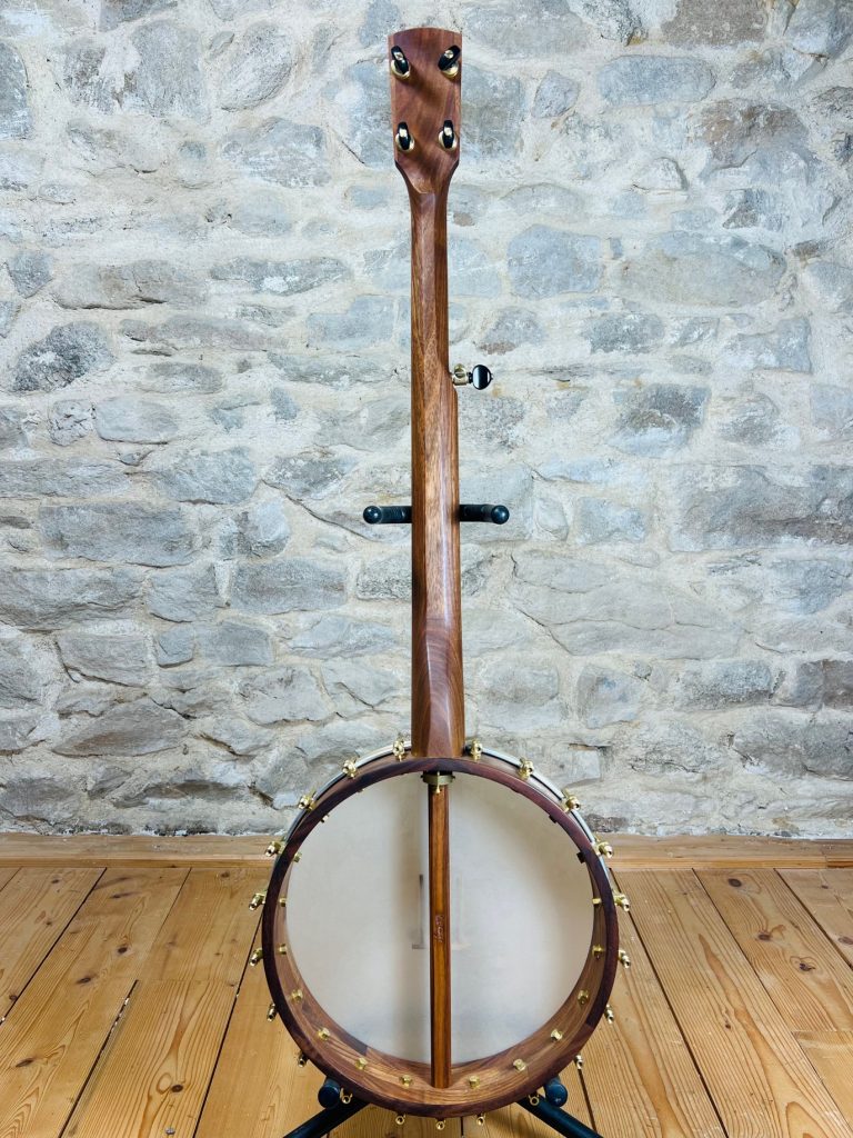 Semi fretless banjo, with a thin 12″ blockrim (no tonering)and a seeger style bridge. This banjo also had a neck carved with a trapezoidal profile !